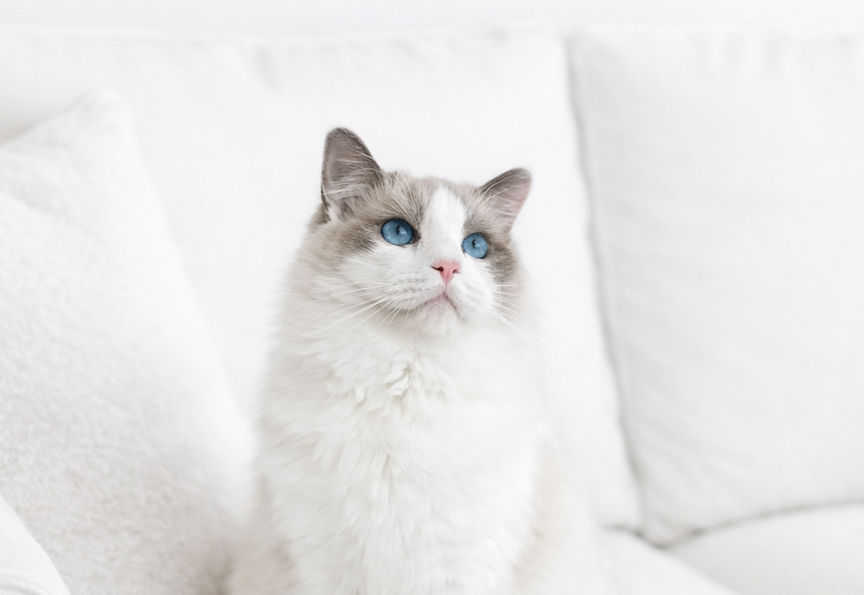 Snowy is an 8-month-old Blue Bicolor ElleRagdoll who would thrive in a calm, adult-oriented household where he can truly be the center of attention. He is best suited for a home without young children, as he prefers a peaceful environment and one-on-one companionship. While Snowy does not enjoy being held or carried for long periods, he deeply values closeness and connection—choosing instead to sit beside you, lounge nearby, or quietly follow you from room to room. He is a devoted little shadow who loves being involved in your daily routine without needing constant handling. Even at 8 months he is now 12lbs of fluffy cuteness!